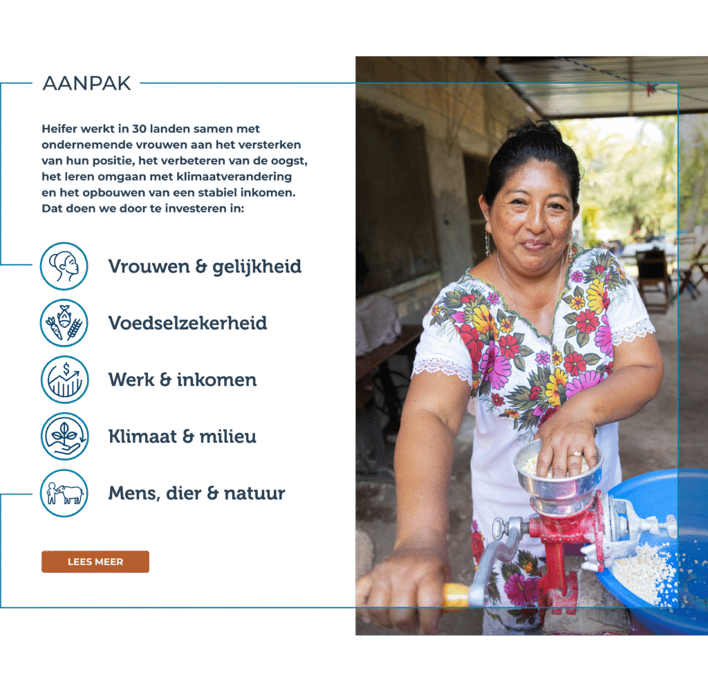 Van de koffie die je drinkt tot de rijst die je eet – vaak hebben vrouwelijke boeren hier uren hard voor gewerkt. Toch krijgen juist zij de minste kansen. Daarom steunt Heifer ondernemende vrouwen in landen als Guatemala, Malawi en Nepal, zodat ze het beste uit zichzelf kunnen halen. We investeren in eerlijk voedsel op ons bord en een duurzame toekomst op het land – hier én daar.