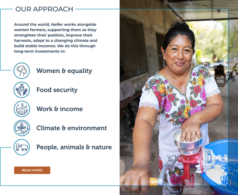 Around the world, Heifer works alongside women farmers, supporting them as they strengthen their position, improve their harvests, adapt to a changing climate and build stable incomes. We do this through long-term investments in: