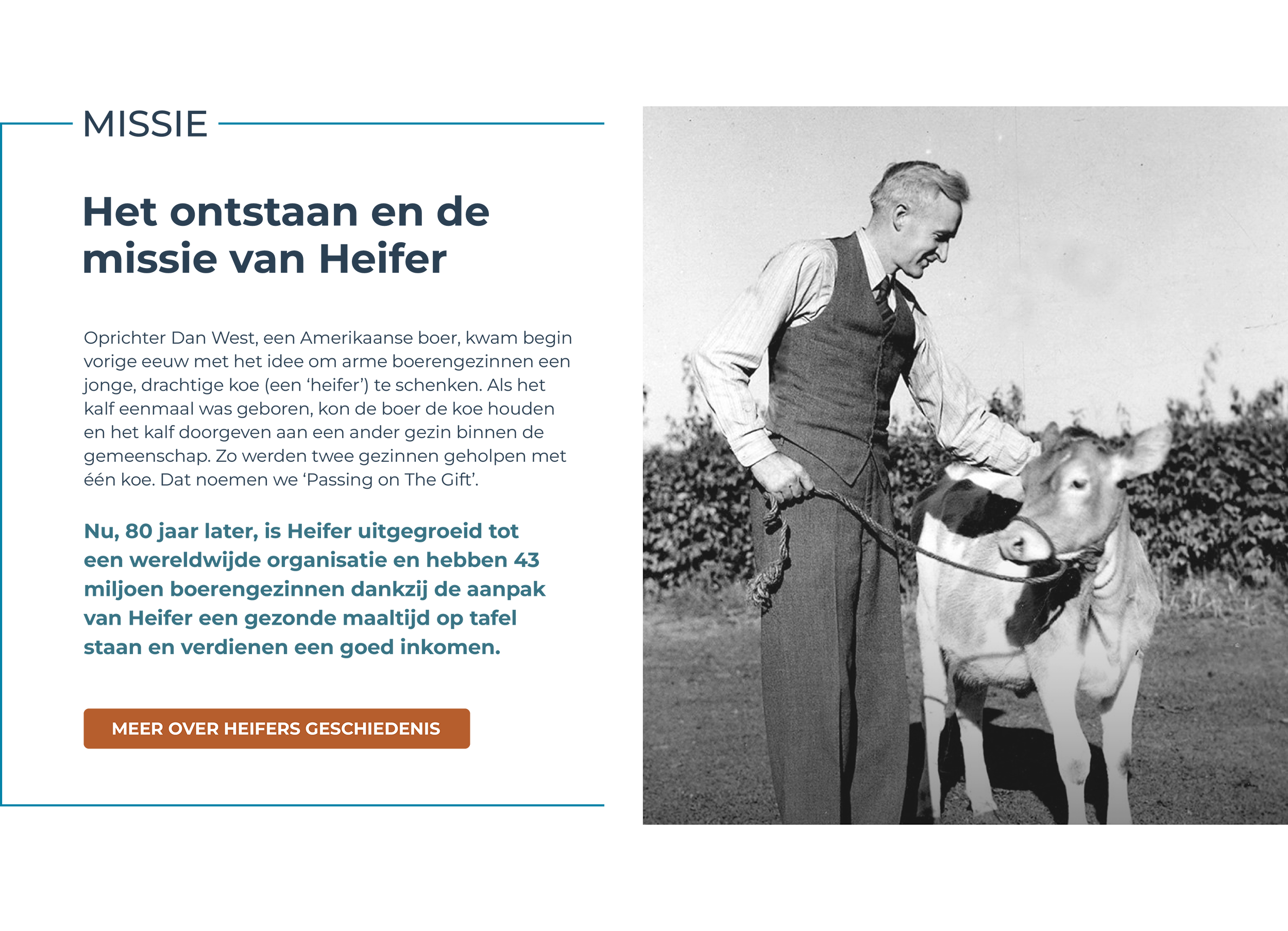 Al sinds 1944 zet Heifer zich in voor de strijd tegen honger en armoede. Heifer Nederland is een zelfstandige ontwikkelingsorganisatie. We maken deel uit van het internationale Heifer-netwerk en werken in meer dan 30 landen wereldwijd.