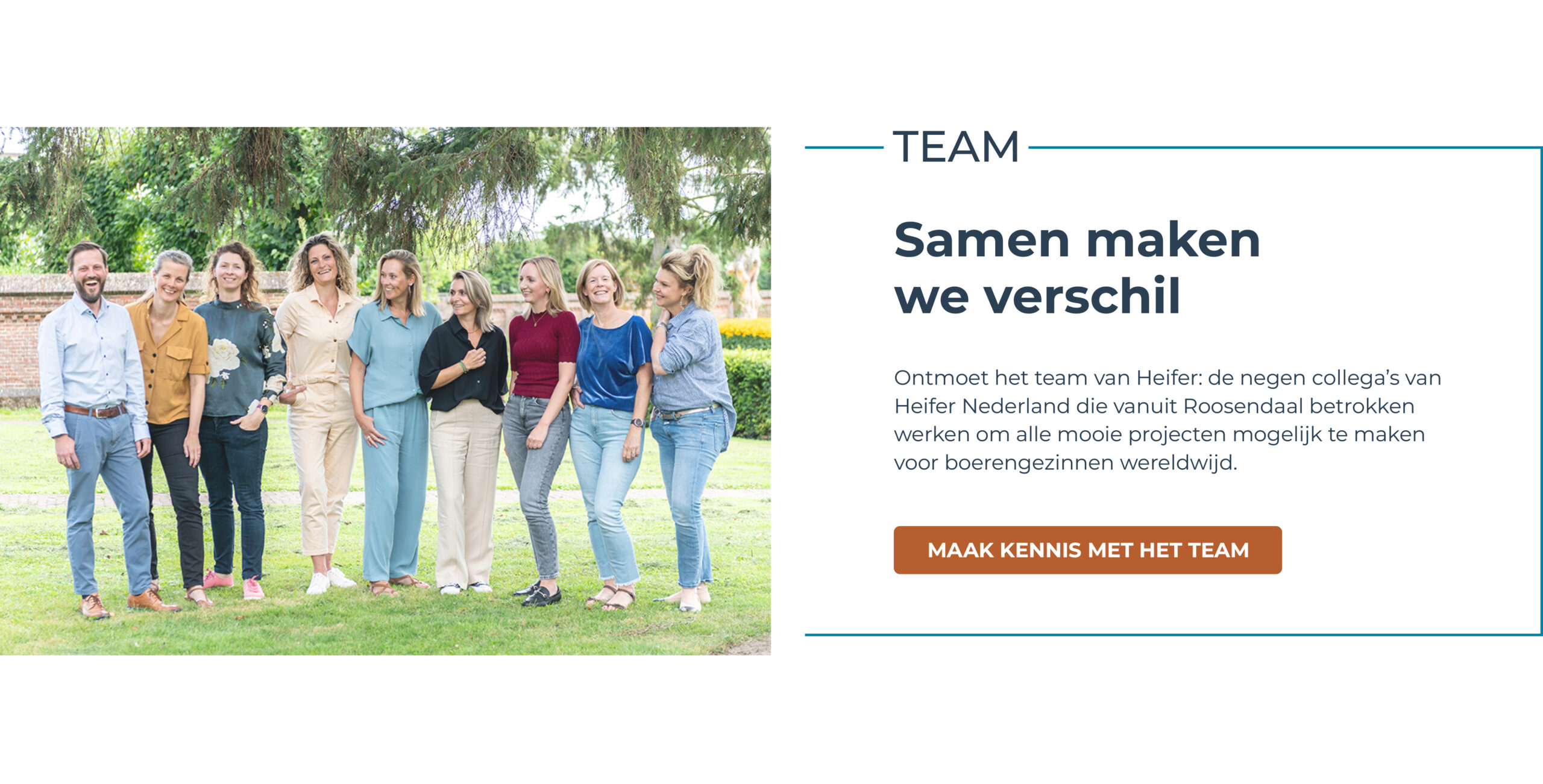 Ontmoet het team van Heifer, de negen collega’s die vanuit Roosendaal betrokken werken om alle mooie projecten mogelijk te maken voor boerengezinnen wereldwijd.